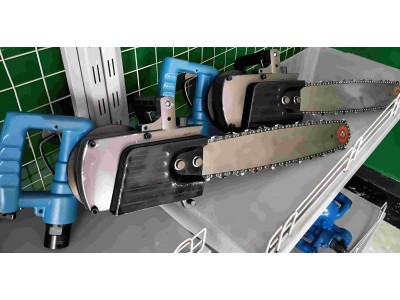 风动链条锯是采用气动原理,通过压缩空气带动工作。替代了手工刀锯截木料,既减轻了人们笨重体力劳动,又提高截割速度。
