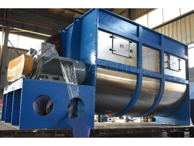 卧式螺带混合机可以有效率、快速的混合物料,在搅拌轴的螺旋带运动下使内外螺旋带在较大范围内翻动物料,内螺旋带将物料向内侧运动,外螺旋带将物料由两侧内向运动,使物料来回掺混,另部分物料被螺旋带推动下,沿轴向径向运动,从而形成对流循环,由于上述运动的搅拌,物料在较短时间内获得快速均匀混合。