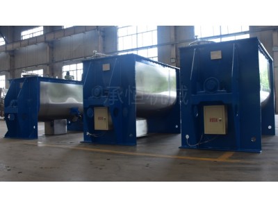 1.卧式螺带混合机由混合仓、搅拌器、驱动装置基本组成,U型管状仓内安装双层异向螺带盘绕的搅拌器轴,外螺旋带在动力的驱动下,其盘绕形式配合旋转方向把物料从U型仓两端推动, 而内螺旋带把物料从中间向两端推动,形成对流混合。