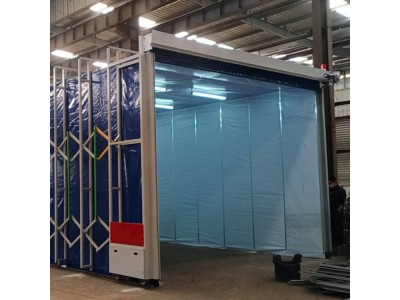 移动伸缩前室由钢架结构和阻燃PVC布组成,通过平行四边形连杆机构或轨道驱动系统实现自动展开与合拢。工作时,前室沿轨道平滑移动至工件上方,形成封闭/半封闭空间进行喷漆;完成后收缩至一侧,节省空间并实现多工序共用场地。其核心系统包括: