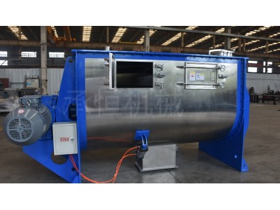 螺带式混合机是一种常用的混合设备,主要由U型筒体、螺带搅拌器、动力装置和密封装置组成。U型筒体可以根据客户要求做成不锈钢、碳钢或镀层材质,端板则一般用碳钢制成并覆盖一层不锈钢以避免污染物料。螺带搅拌器配置了双层螺带,两层螺带方向不同,同时搅拌会使物料在筒体内形成对流循环,从而达到快速混合物料的目的。卧式螺带混合机的动力装置是电机和减速机,通过十字滑块联轴器链接,小型的卧式螺带混合机电机和减速机之间是直接链接,而1000L以上的卧式螺带混合机则使用皮带轮链接。卧式螺带混合机的密封装置采用填料密封,在搅拌器的轴头上有填料密封。