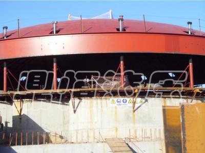 液压提升器利用液压提升装置(成套设备)均布于储罐内壁圆周处,先提升罐顶及罐体的上层壁板,然后逐层组焊罐体的壁板。