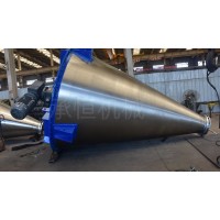 锥形螺带混合机的搅拌装置通常由螺旋轴和两根与筒体内壁表面吻合的外螺带组合而成。旋转时,外螺带由下向上沿筒体内壁盘旋提升物料,由于螺带带面上各点线速度不同,物料在其作用下产生不规则的对流、剪切、掺混、扩散,形成复合运动。搅拌轴上的螺旋叶片,运转时又将物料提升、抛出,被抛出的物料一部分进入螺带,同时,被螺带抛出的部分物料又被吸收到螺旋叶片的螺旋包络体内被提升。如此反复循环,使物料在短时间内达到均匀混合。