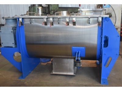 卧式螺带混合机主要由驱动机构、u型容器、螺带搅拌机构、机盖、支架及出料机构等部分组成。其主要由安装于搅拌轴上的内外径螺旋带动桶体内物料翻动,使搅拌器在桶体内大范围翻动物料。搅拌器结构上,螺旋设计成内外、左右